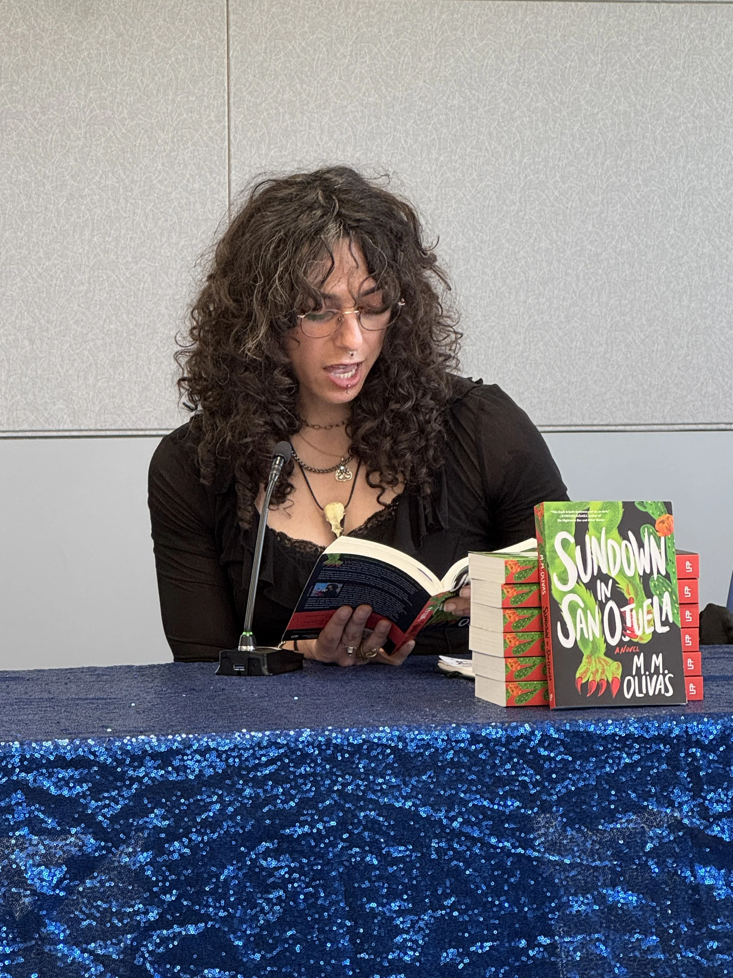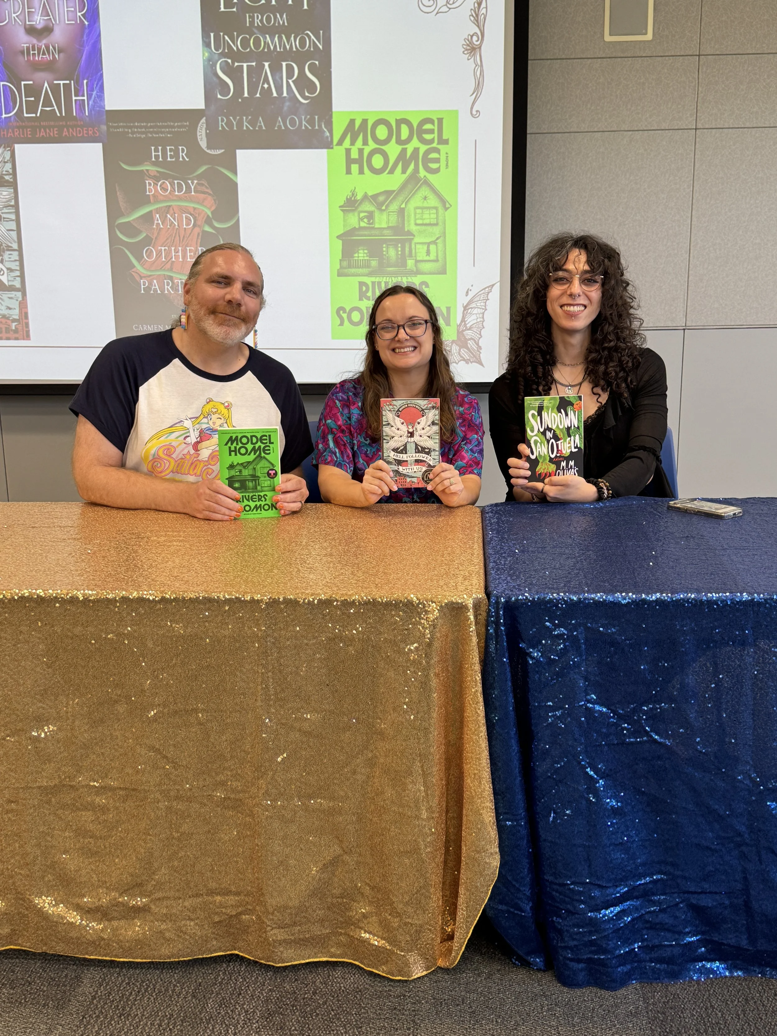 The 40 people who participated in person received a free book by a queer and/or trans author, including Charlie Jane Anders, Mara “M.M.” Olivas, Ryka Aoki, Andrew Joseph White, and Rivers Solomon. A highlight of the event was a reading by Olivas, a trans femme author and recent SJSU MFA graduate, who read from her new novel and then joined an MA class in literature after the event.